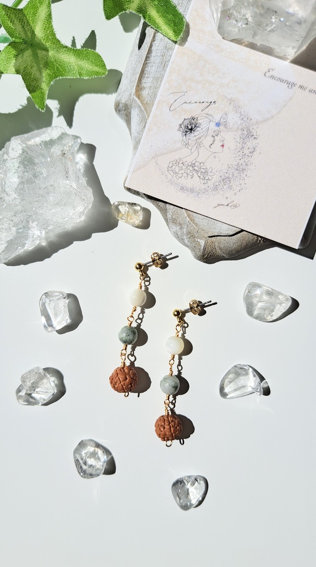 〜Universe〜 この世界にあるもの全てに 命が宿り 叡智が宿っています 意味のないこと 無駄なことは 1つもありません 全てがこの世界を彩る 大切な役割を担っています あなたも自分の価値を 見誤らないでください どんな時のあなたも 大切で尊い 重要な宇宙の一部 あなたはあなたのまま 輝き続けてください 私たちはいつも、どんなときも あなたを見守り 応援しています ** 高品質ネパール産の菩提樹と、 国産の糸魚川翡翠。 マザーオブパールを使用した 浄化&お守りに最適の組み合わせ☆ こちらは私も普段使いしているデザイン♪ 最高の御守りとして愛用しています☆ ヒーラーさんや接客業の方など、 エネルギーを受けやすい方にもオススメです。 菩提樹(ルドラクシャ)… 菩提樹の実は、強力な浄化力を持ち、 魔除け、邪気除けの御守りとして人気です。 お釈迦様が悟りを開いたのが、 菩提樹の木の下だったと言われており 縁起の良い木としても有名。 エネルギーのバランスがめちゃめちゃいいです! こちらは高品質なネパール産の菩提樹を 使用しています。 糸魚川翡翠… 新潟県の糸魚川で採掘される国産の石。 古くから魔除けや厄除けの石として 日本の歴史に大きく関わってきました。 霊性を高め、潜在能力を高めてくれます。 エネルギー的にも非常に高い波動を持つ石です。 ヒーリング力も抜群で、 ストレスを感じている方や悩みなどを 抱えている方の力にもなってくれるでしょう。 持ち主のエネルギーやオーラを活性化させ、 運気や良い流れを呼び込むとも言われています。 マザーオブパール… 海由来のパールは、高い浄化力を持ち、 持ち主の心を癒してくれます。 困難に打ち勝つパワーを与えてくれ、 おおらかな心で前進していくサポートをしてくれます。 ◆ピアスとイヤリングはパーツ変更可能です。 必ず下記のパーツ一覧からお選びください。 ◆素材:菩提樹(実)10mm、 糸魚川翡翠(国産)6mm、 マザーオブパール6mm、 14kgfワイヤー、金属パーツ ※14kgf…ゴールドフィルドとは、素材に 14金ゴールドを圧着させたものです。 メッキよりも丈夫で剝がれにくく、 金属アレルギーが起こりにくいという 特徴もあります。 ◆長さ:約4.5cm ◆天然石は1つ1つ大きさや色合い、 模様などが異なります。 内部クラックや内包物が含まれている場合が ございます。「石の魅力」として 捉えていただけたらと思います。 ◆お使いのモニターにより色味や質感など、 実際の商品と異なる場合がございます。 ◆アレルギー素材のものでも、全ての方に アレルギー反応が出ないとは限りません。 ◆ハンドメイド商品です。 負荷を加えると破損することもございます。 お取り扱いにはご注意ください。 ◆◆送料について◆◆ 7000円以上で送料無料となります。