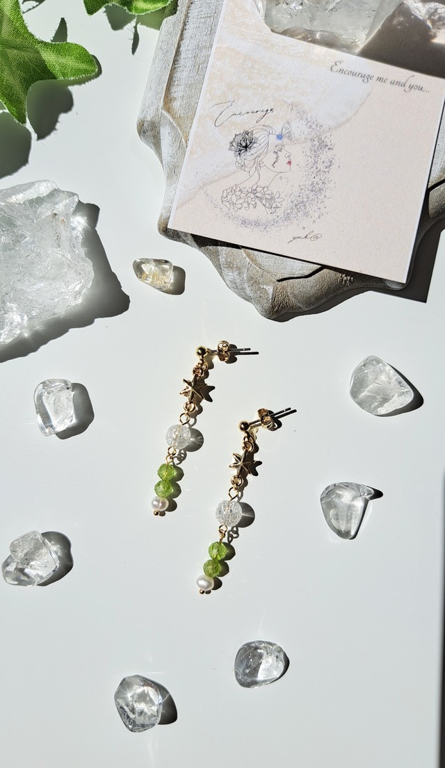 〜心に、光を〜 いつも楽しく 元気な自分でありたい 笑顔あふれる そんな人生を歩んでいきたい まだちょっと不安もあるけど もっと自分を出していってもいいよね 私もあなたも それぞれが笑顔で 楽しい日々を送れたら それだけで宝物だよね ** 可愛らしい星形パーツに 元気を貰えるような石たちを 散りばめました。 キラキラ反射してエネルギー倍増! つけるだけでワクワクするような さりげない可愛さあふれるデザインです♪ ペリドット… 太陽を象徴する石として知られています。 ネガティブな感情や悩みを吹き飛ばし、 ポジティブなエネルギーへと変換してくれます。 草原を思わせるような爽やかなグリーンは、 心をゆったりと開放し、 あなた自身が太陽だということを 思い出させてくれます。 ◆ピアスとイヤリングはパーツ変更可能です。 必ず下記のパーツ一覧からお選びください。 ◆素材:クラック水晶6mm、 ペリドット4mm、 淡水パール4mm、 星形パーツ、金属パーツ ◆長さ:約4.5cm ◆天然石は1つ1つ大きさや色合い、 模様などが異なります。 内部クラックや内包物が含まれている場合が ございます。「石の魅力」として 捉えていただけたらと思います。 ◆お使いのモニターにより色味や質感など、 実際の商品と異なる場合がございます。 ◆アレルギー素材のものでも、全ての方に アレルギー反応が出ないとは限りません。 ◆ハンドメイド商品です。 負荷を加えると破損することもございます。 お取り扱いにはご注意ください。 ◆◆送料について◆◆ 7000円以上で送料無料となります。
