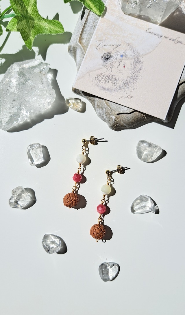 〜Universe〜 この世界にあるもの全てに 命が宿り 叡智が宿っています 意味のないこと 無駄なことは 1つもありません 全てがこの世界を彩る 大切な役割を担っています あなたも自分の価値を 見誤らないでください どんな時のあなたも 大切で尊い 重要な宇宙の一部 あなたはあなたのまま 輝き続けてください 私たちはいつも、どんなときも あなたを見守り 応援しています ** 高品質ネパール産の菩提樹と、 高品質のインペリアルロードナイト。 マザーオブパールを使用した 浄化&お守りにオススメの1点☆ こちらは高品質の赤色、 インペリアルロードナイトがアクセント♪ ヒーラーさんや接客業の方など、 エネルギーを受けやすい方にもオススメです。 菩提樹(ルドラクシャ)… 菩提樹の実は、強力な浄化力を持ち、 魔除け、邪気除けの御守りとして人気です。 お釈迦様が悟りを開いたのが、 菩提樹の木の下だったと言われており 縁起の良い木としても有名。 エネルギーのバランスがめちゃめちゃいいです! こちらは高品質なネパール産の菩提樹を 使用しています。 インペリアルロードナイト… ロードナイトの中でも鮮やかな赤が 特徴的な高品質なものを インペリアルロードナイトと呼びます。 「博愛」「友愛」の石と呼ばれ、 人間関係を円滑にし、愛や絆を大切に 育んでいくサポートをしてくれます。 肉体や精神のヒーリングとしても有効です。 マザーオブパール… 海由来のパールは、高い浄化力を持ち、 持ち主の心を癒してくれます。 困難に打ち勝つパワーを与えてくれ、 おおらかな心で前進していくサポートをしてくれます。 ◆ピアスとイヤリングはパーツ変更可能です。 必ず下記のパーツ一覧からお選びください。 ◆素材:菩提樹(実)10mm、 インペリアルロードナイト6mm、 マザーオブパール6mm、 14kgfワイヤー、金属パーツ ※14kgf…ゴールドフィルドとは、素材に 14金ゴールドを圧着させたものです。 メッキよりも丈夫で剝がれにくく、 金属アレルギーが起こりにくいという 特徴もあります。 ◆長さ:約4.5cm ◆天然石は1つ1つ大きさや色合い、 模様などが異なります。 内部クラックや内包物が含まれている場合が ございます。「石の魅力」として 捉えていただけたらと思います。 ◆お使いのモニターにより色味や質感など、 実際の商品と異なる場合がございます。 ◆アレルギー素材のものでも、全ての方に アレルギー反応が出ないとは限りません。 ◆ハンドメイド商品です。 負荷を加えると破損することもございます。 お取り扱いにはご注意ください。 ◆◆送料について◆◆ 7000円以上で送料無料となります。