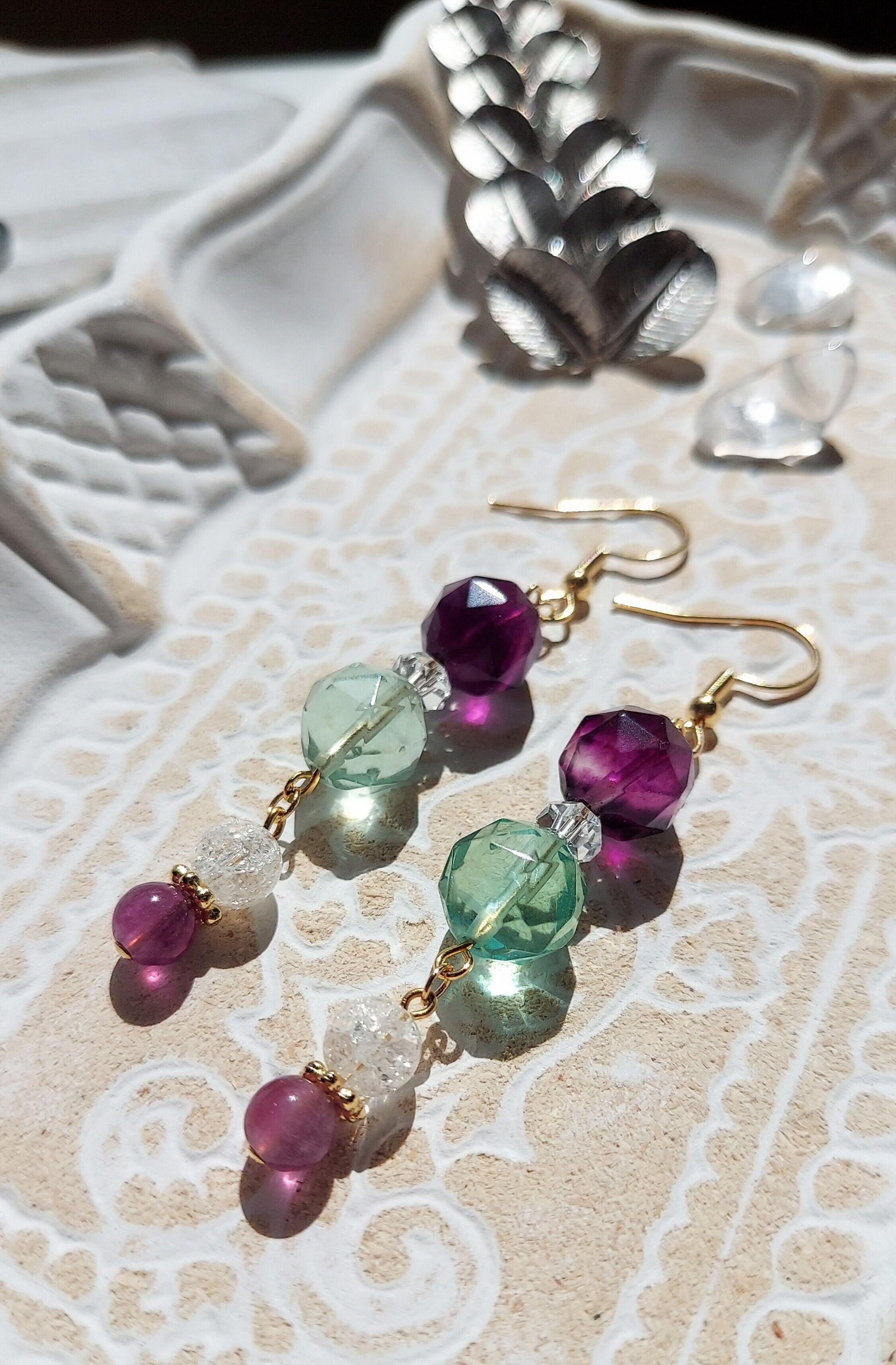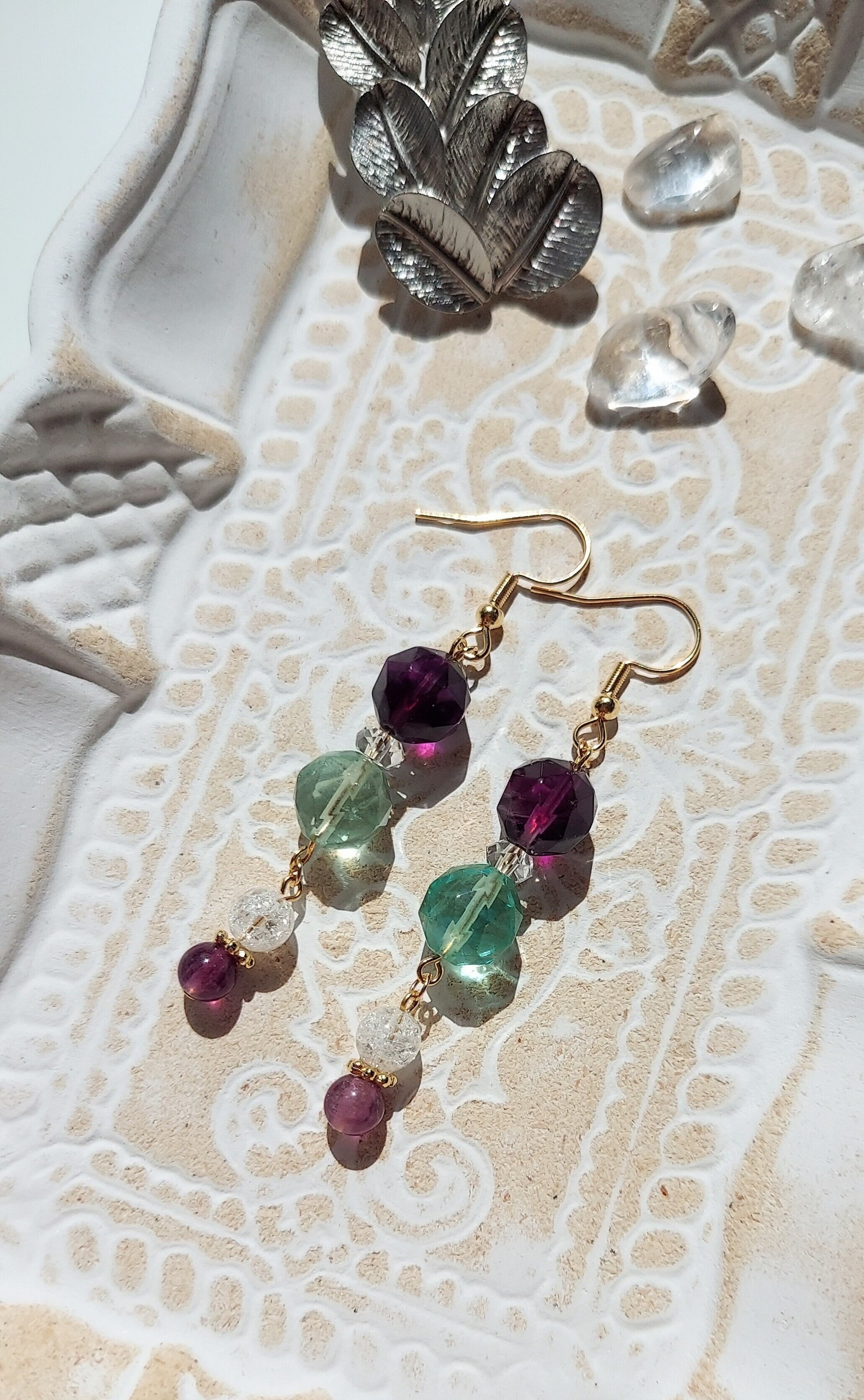 ◆素材:フローライト10㎜玉(紫、グリーン)、ボタンカット水晶、クラック水晶、フローライト6mm玉(紫)、金具、スペーサー