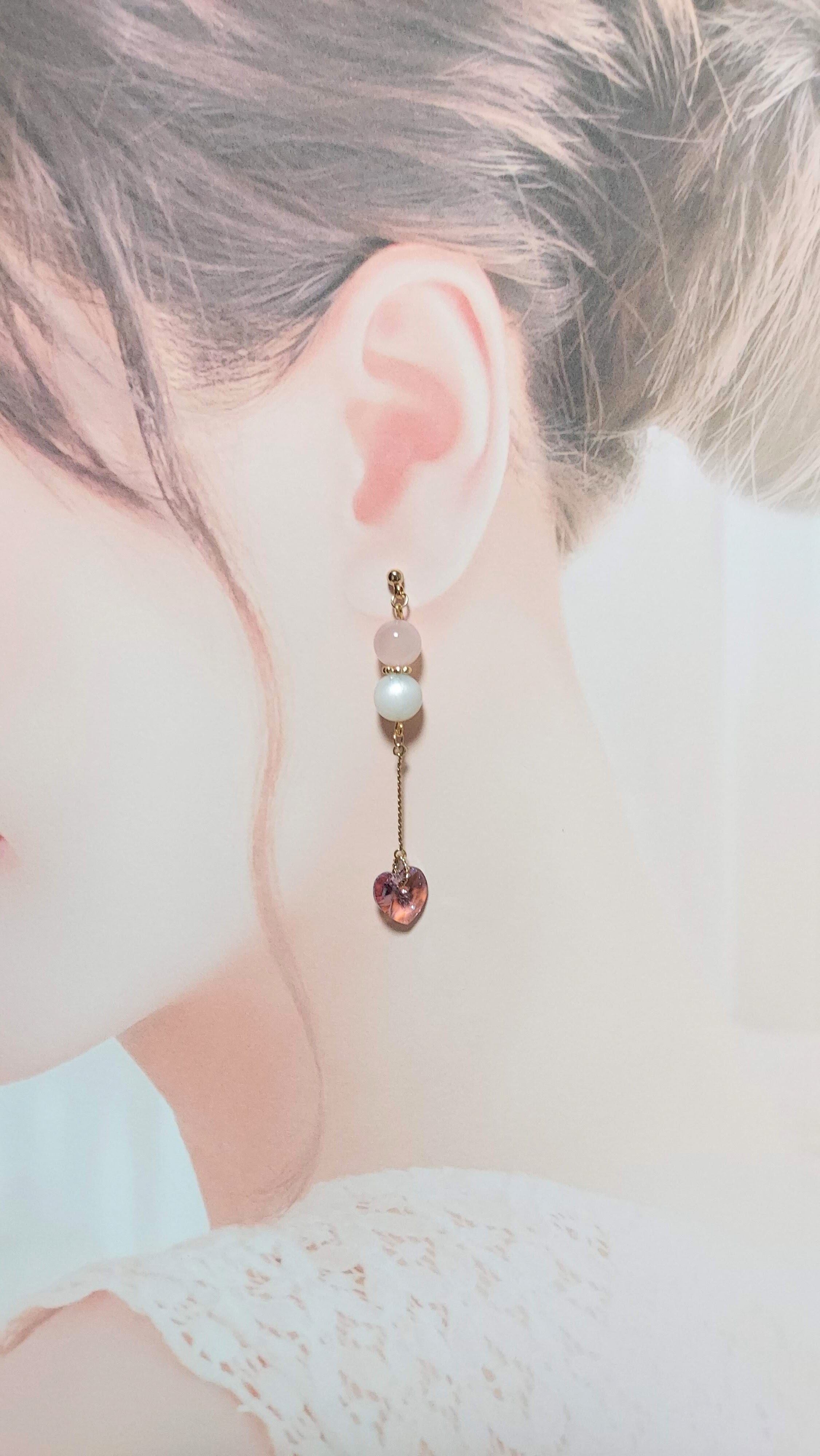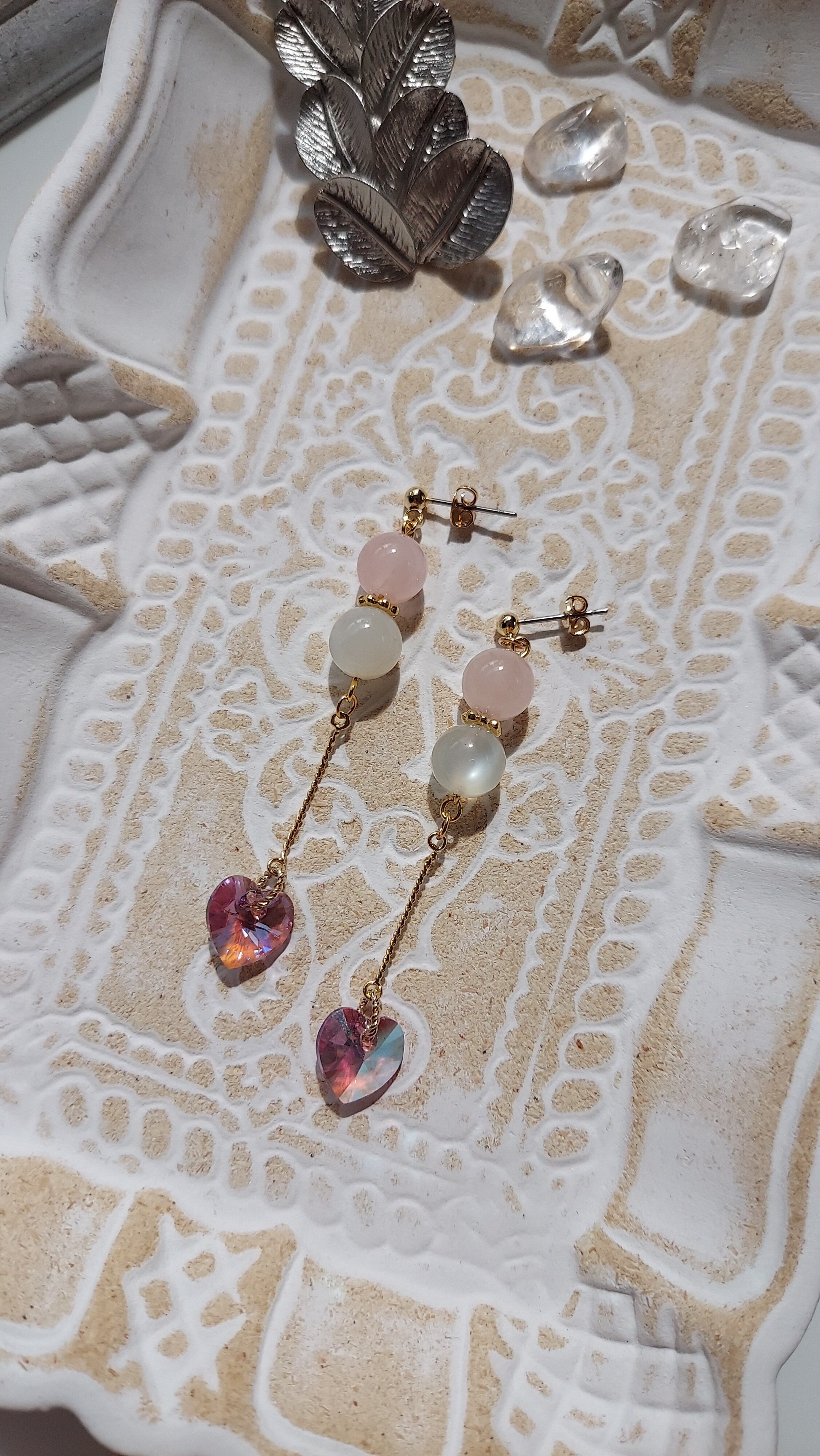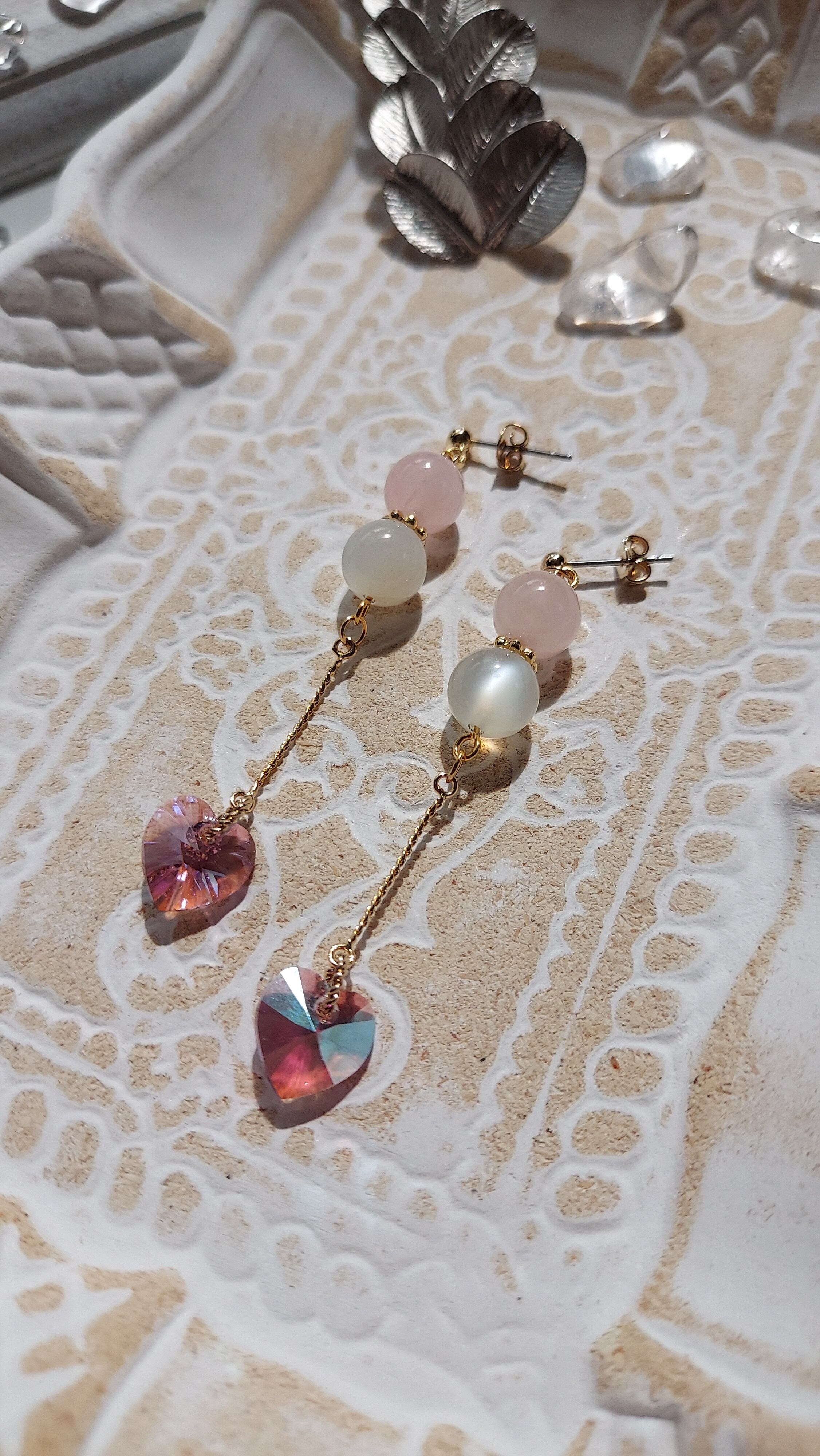 ◆素材:ローズクオーツ、ムーンストーン、スワロフスキーハート、つなぎパーツ、金具
