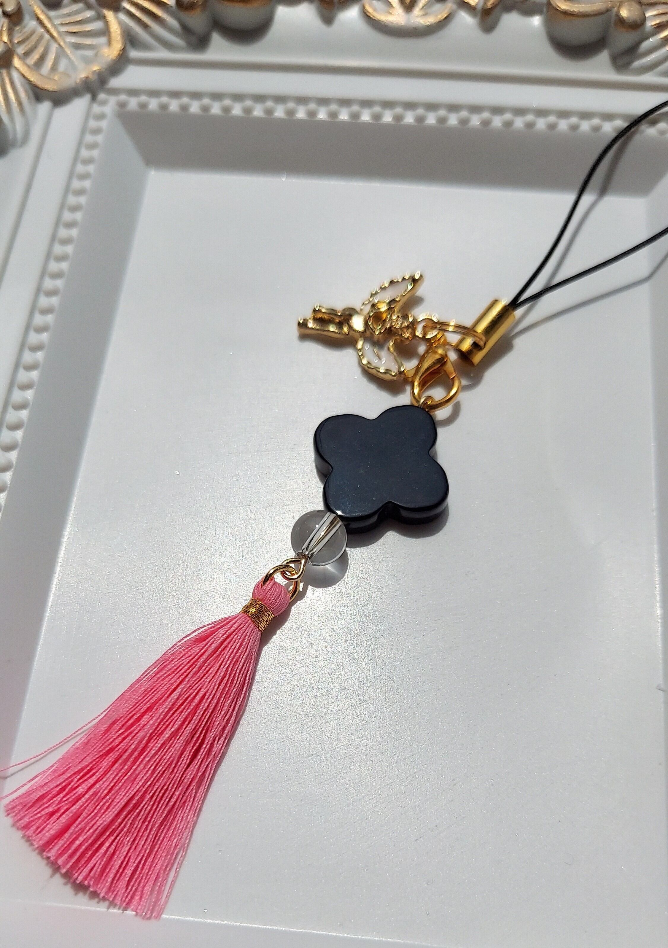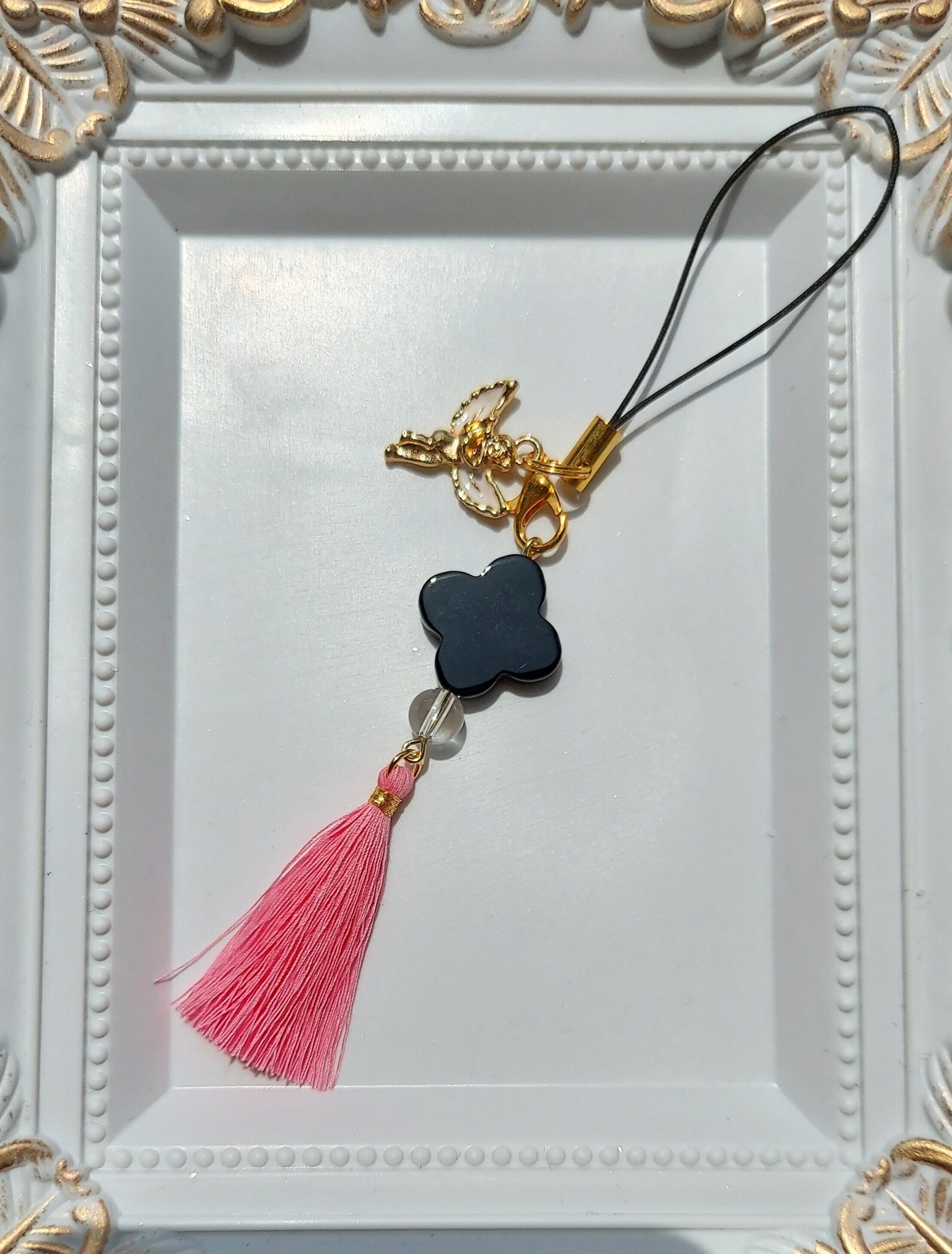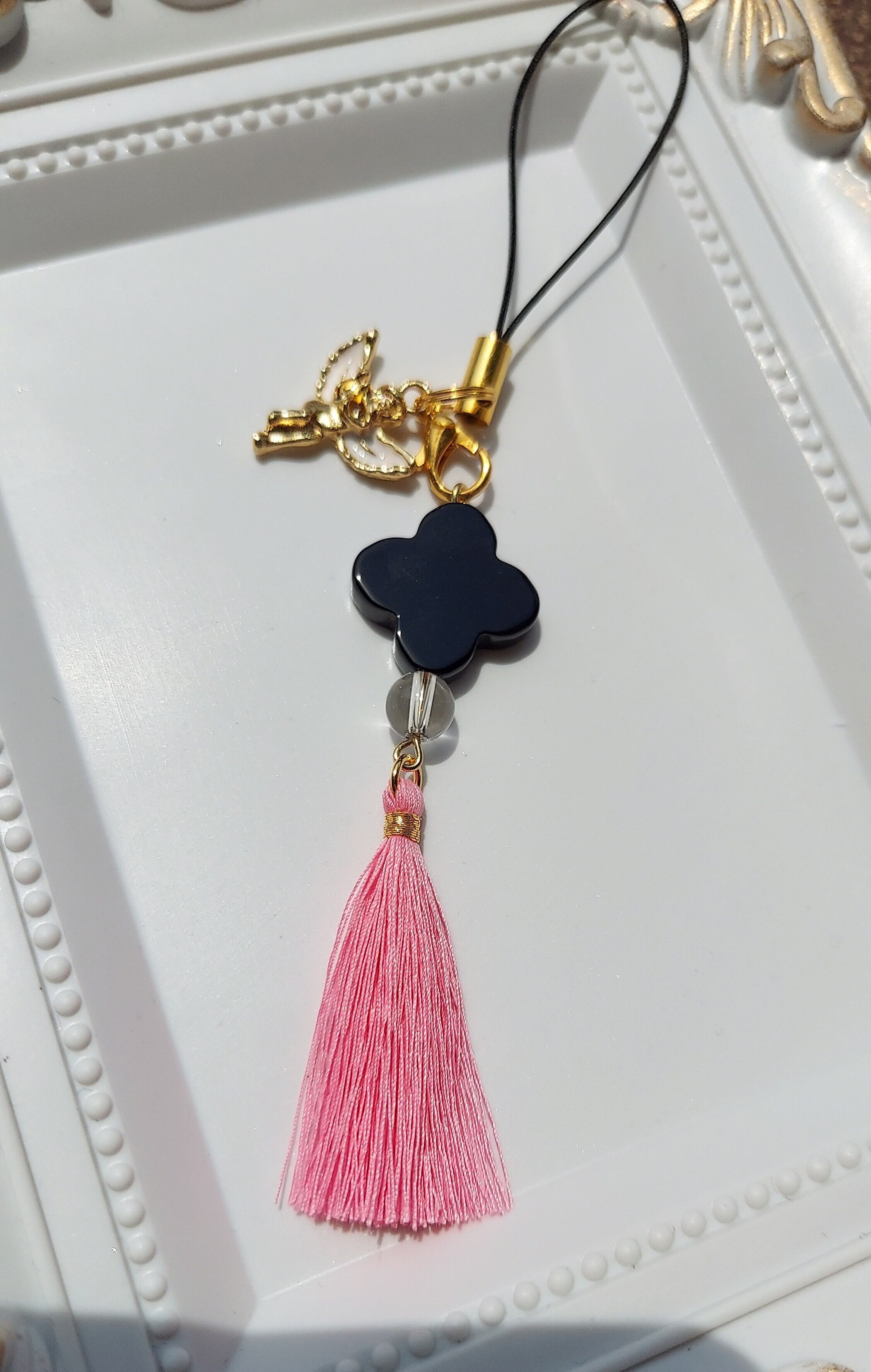 ◆素材:オニキスクローバー、水晶、タッセル、天使チャーム、ストラップ