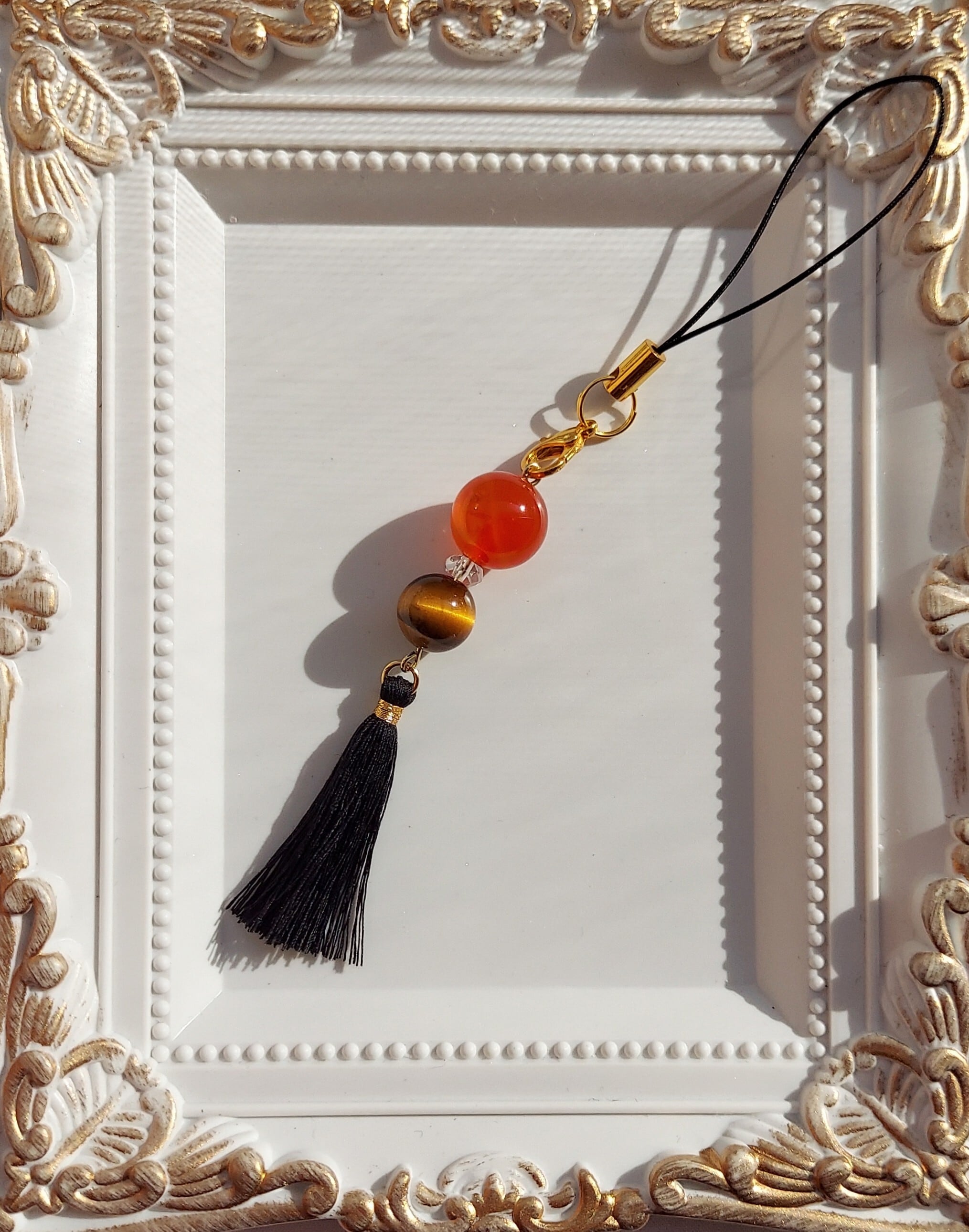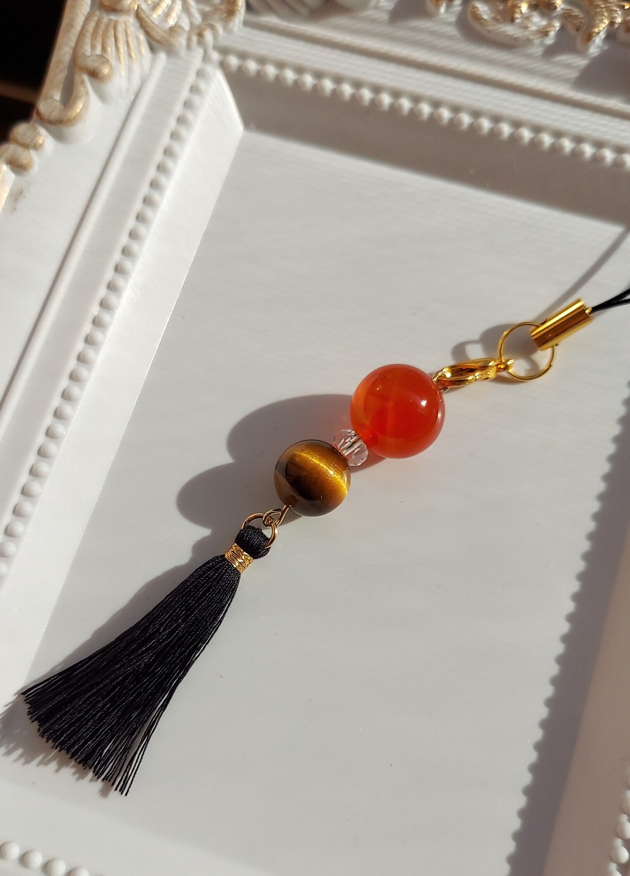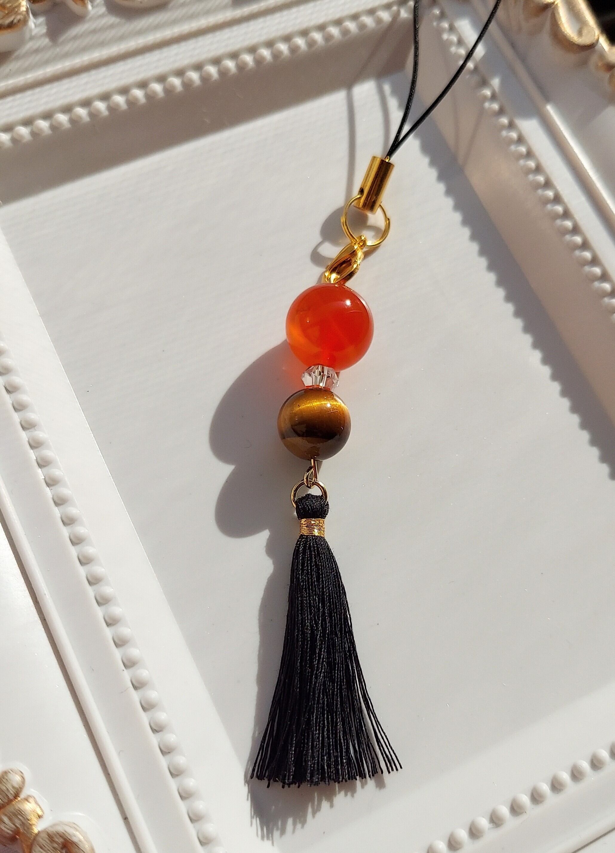 ◆素材:カーネリアン、タイガーアイ、ボタンカット水晶、タッセル、ストラップ