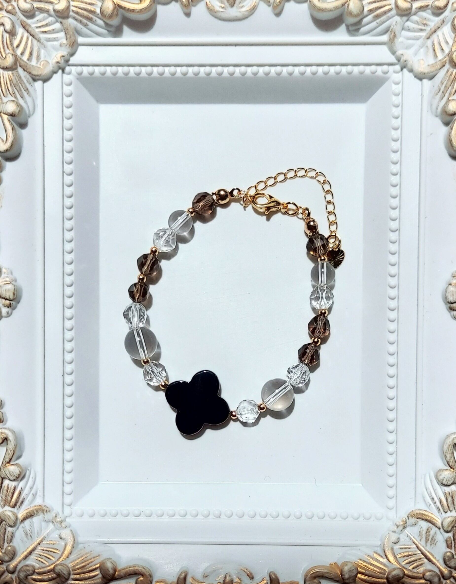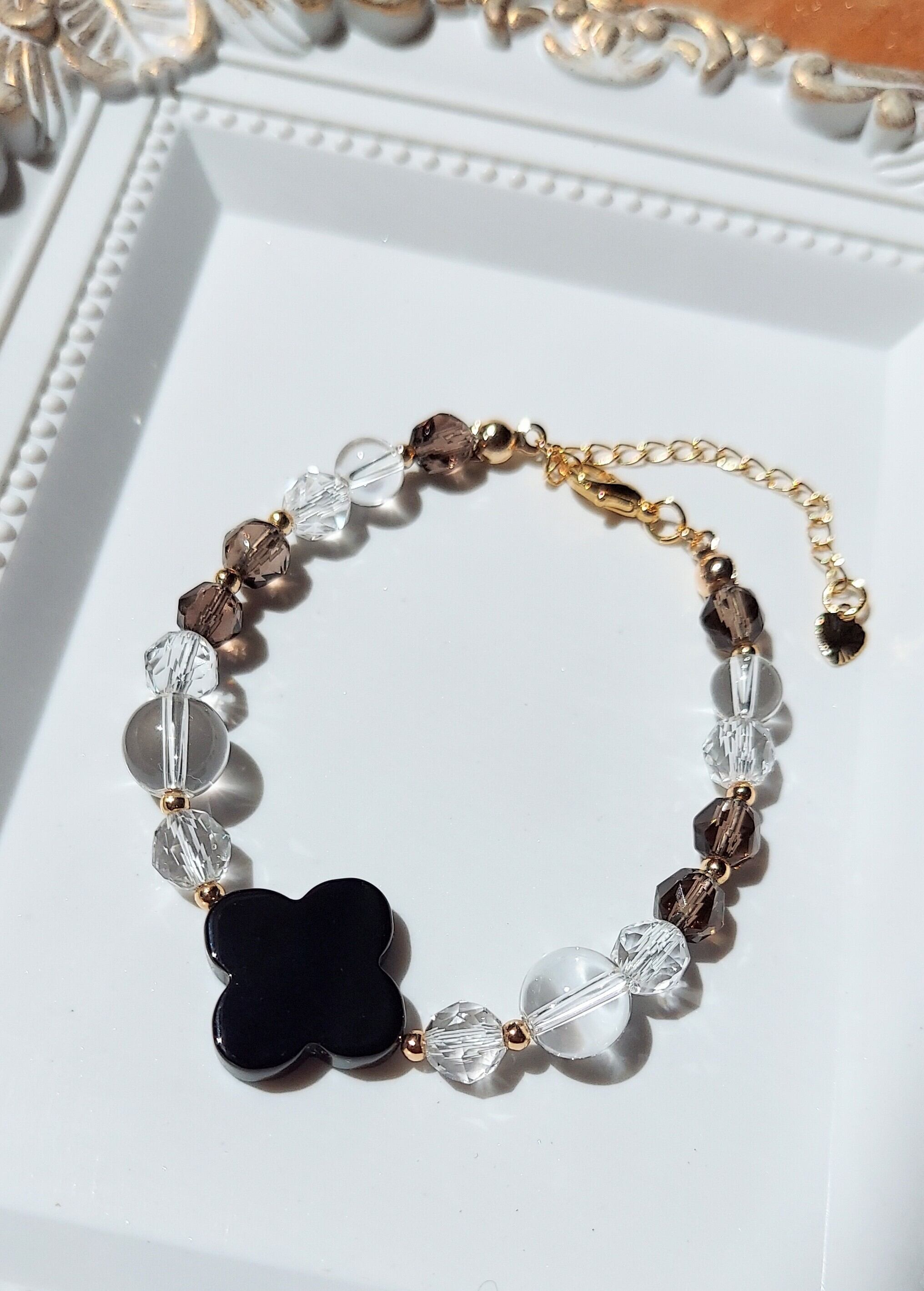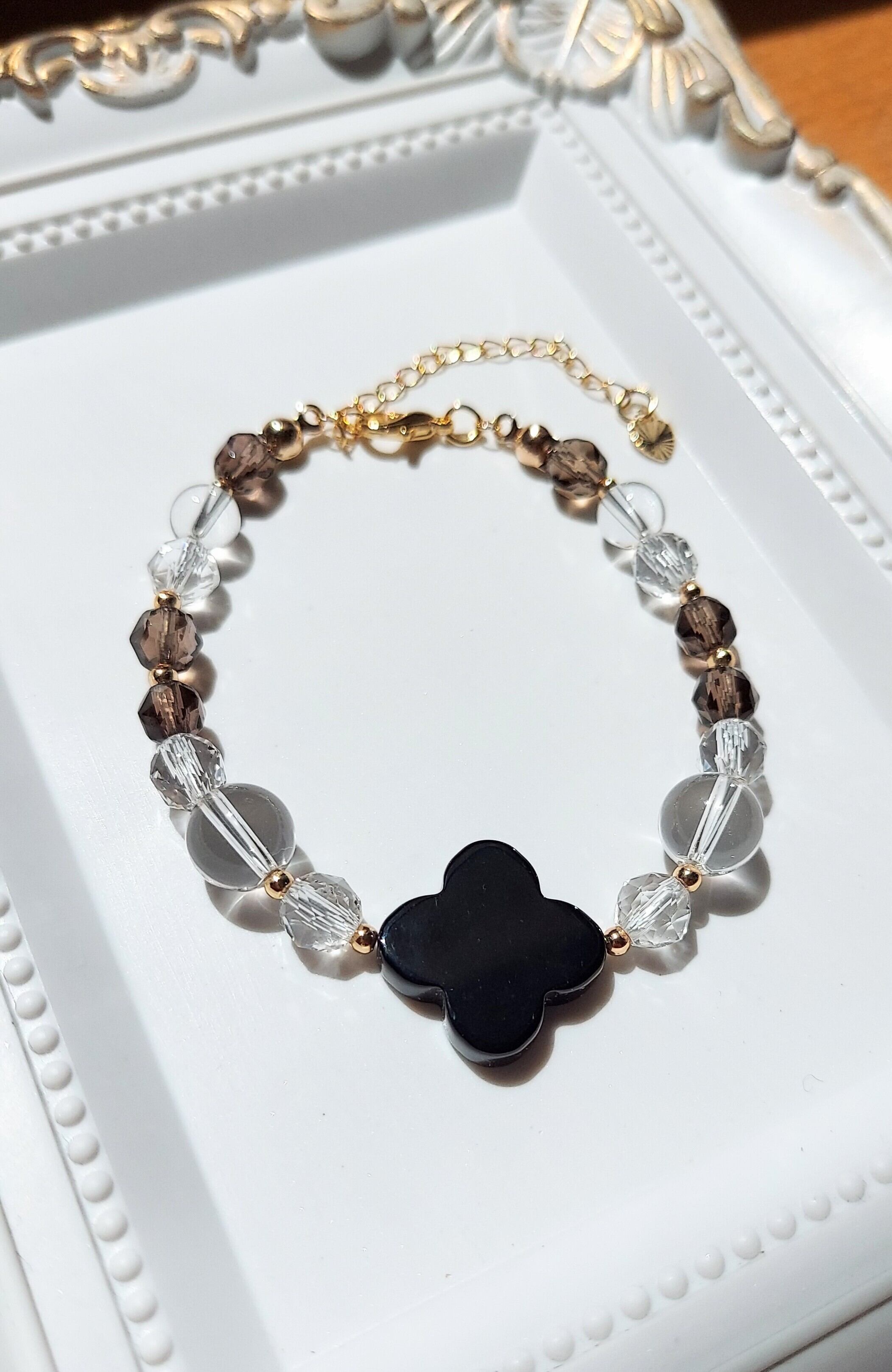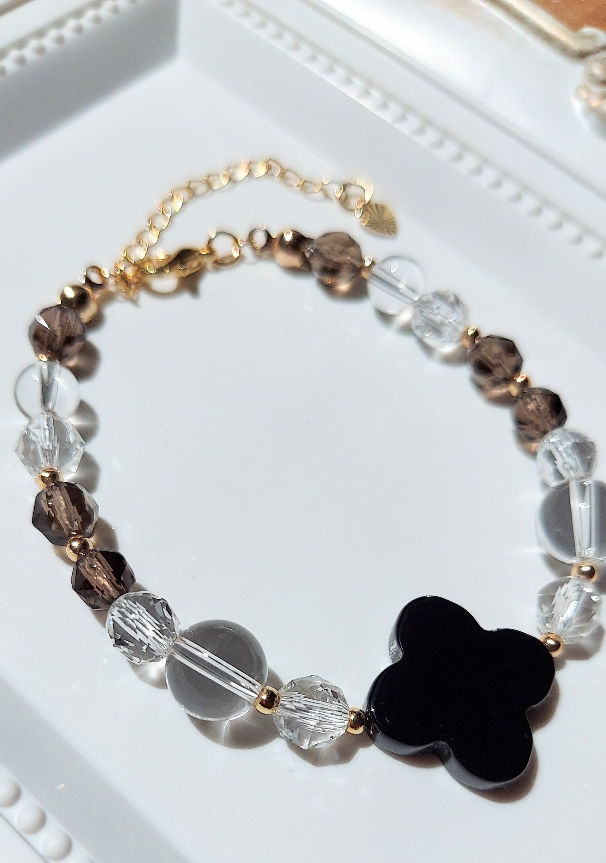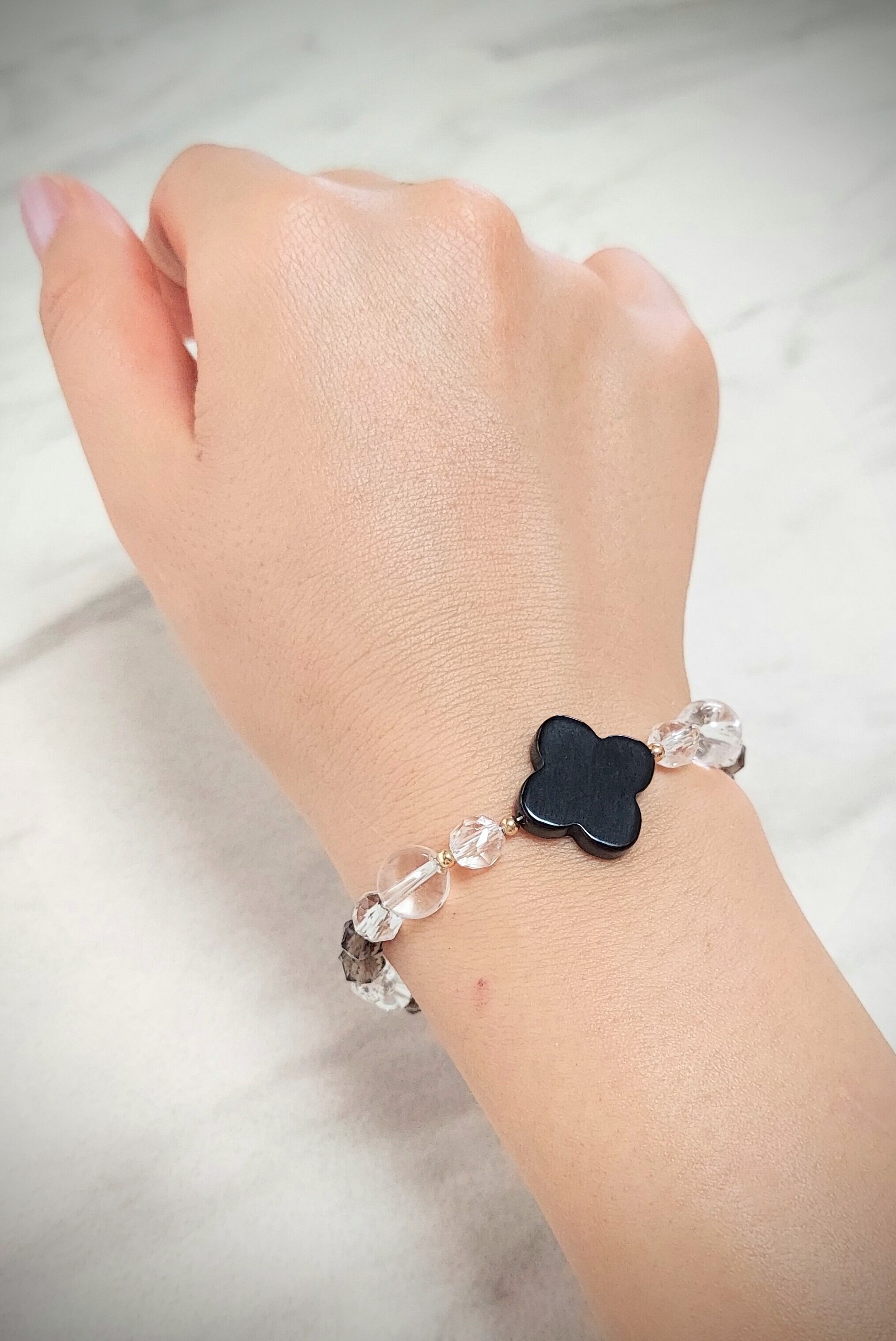 ◆素材:オニキス(クローバー型)約2cm、水晶8mm、水晶6mm、スターカット水晶6mm、スターカットスモーキークオーツ6mm、スムースラウンドビーズ、金属パーツ(14kgf使用)、アジャスター(14kgf使用)