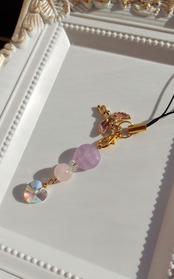 ◆素材:ラベンダーアメジスト、ボタンカット水晶、ローズクオーツ、スワロフスキーハート、天使チャーム、ストラップ