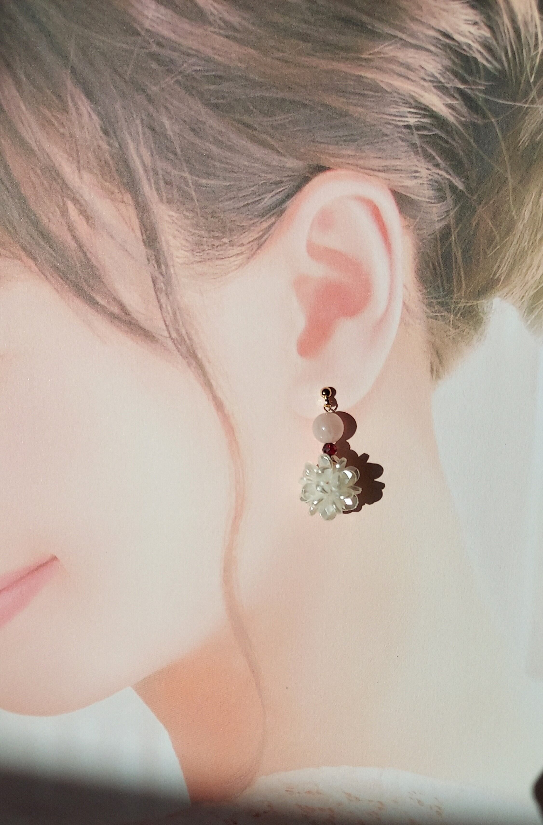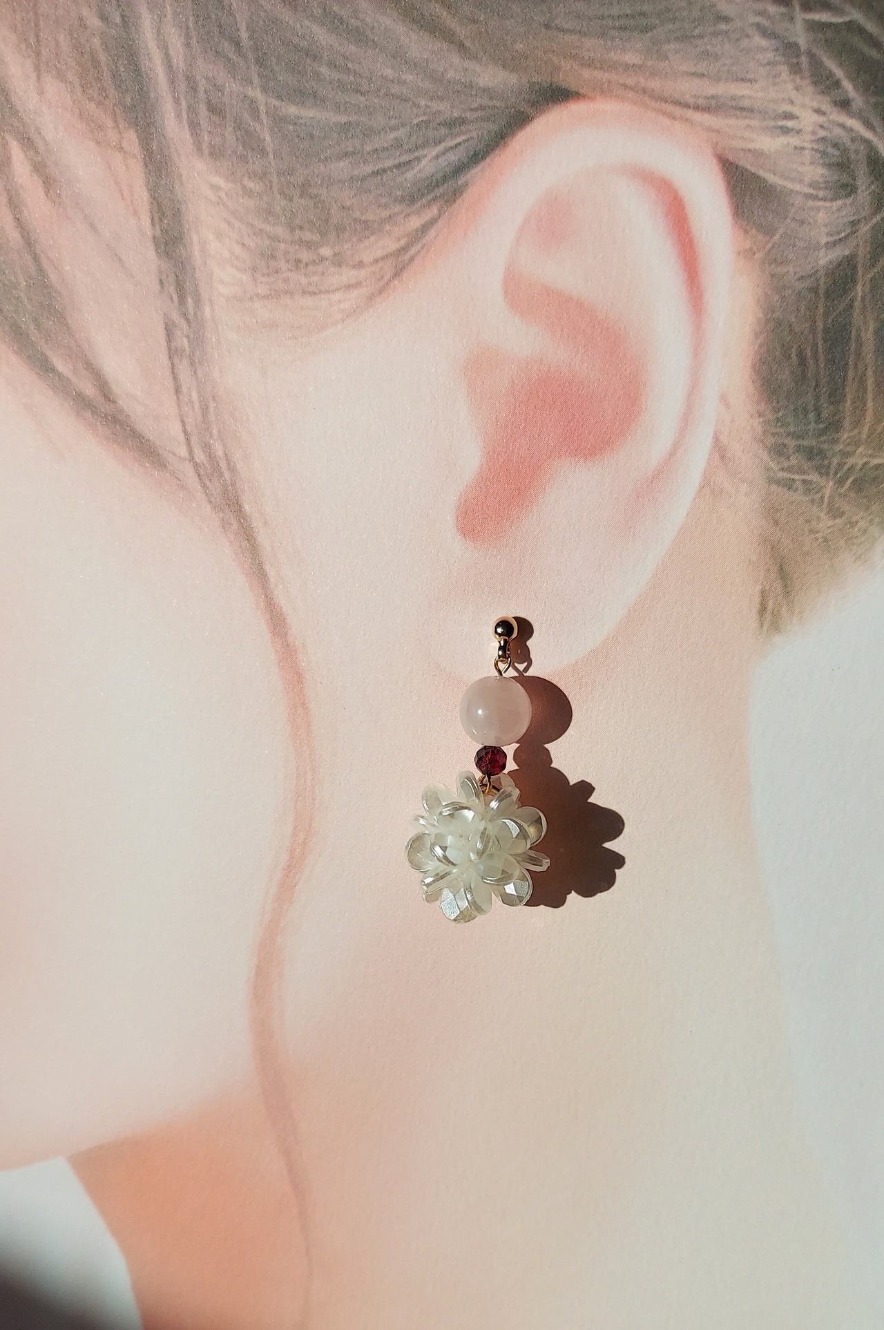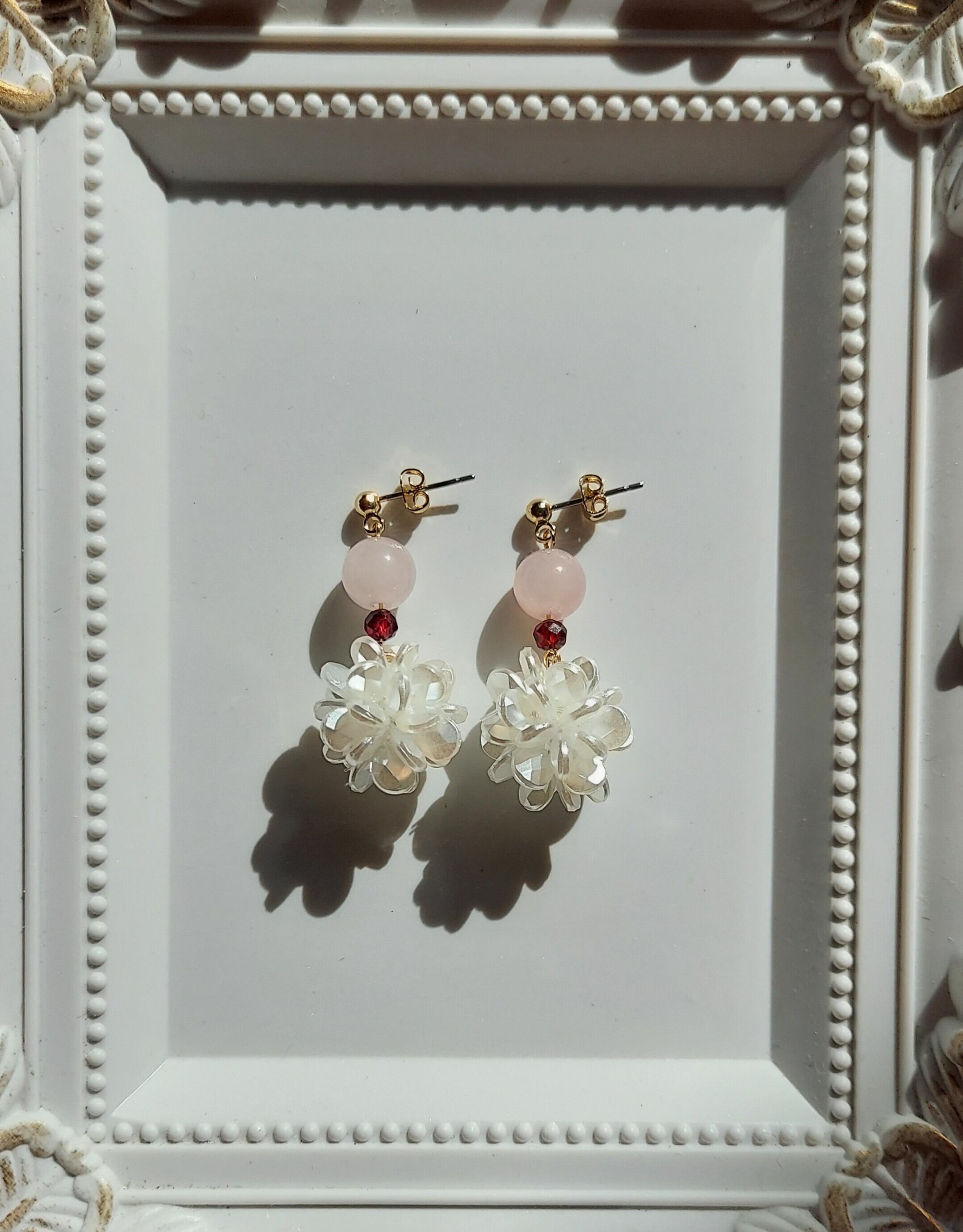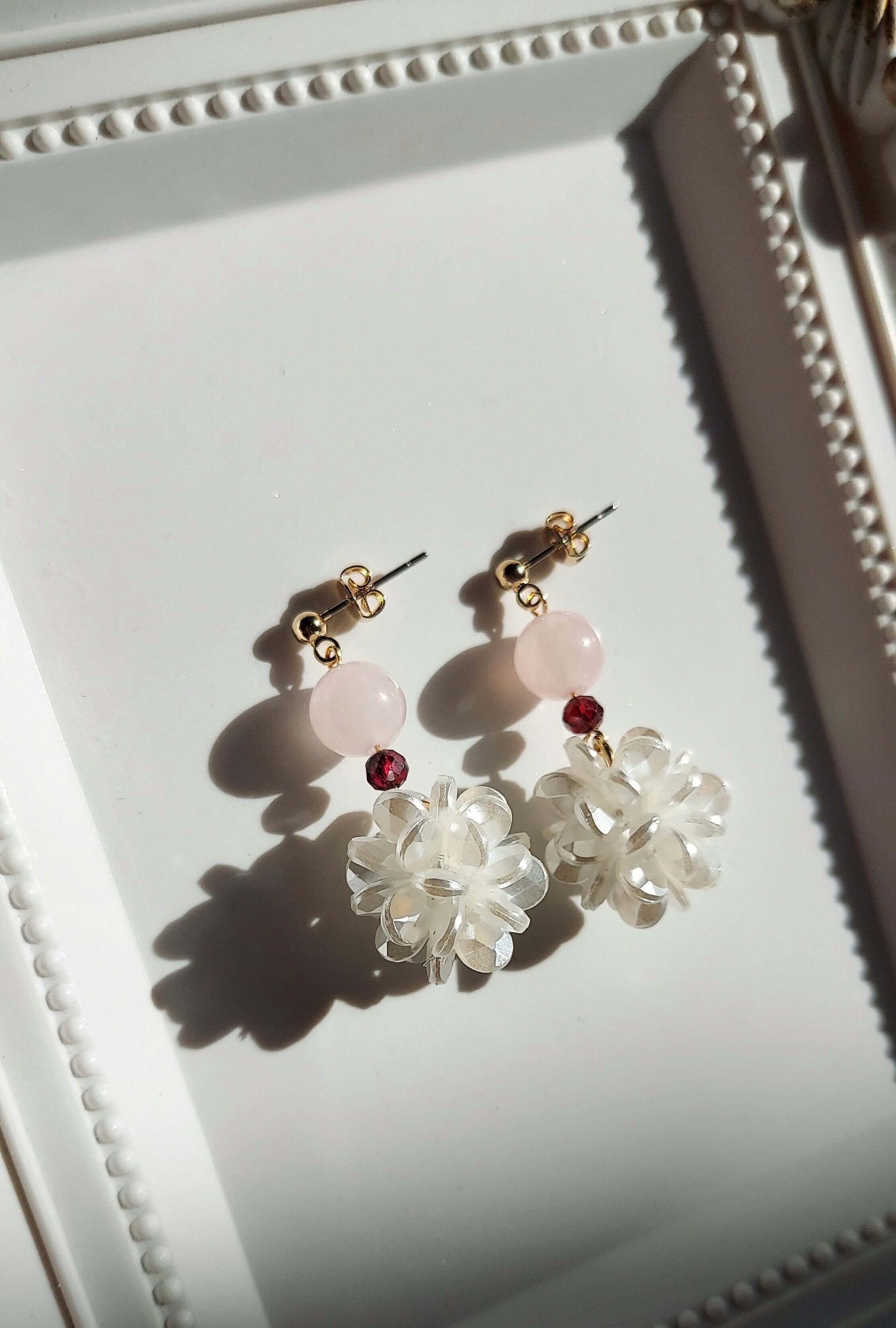 ローズクォーツ&ガーネット フラワービーズ☆ ピアス/イヤリング